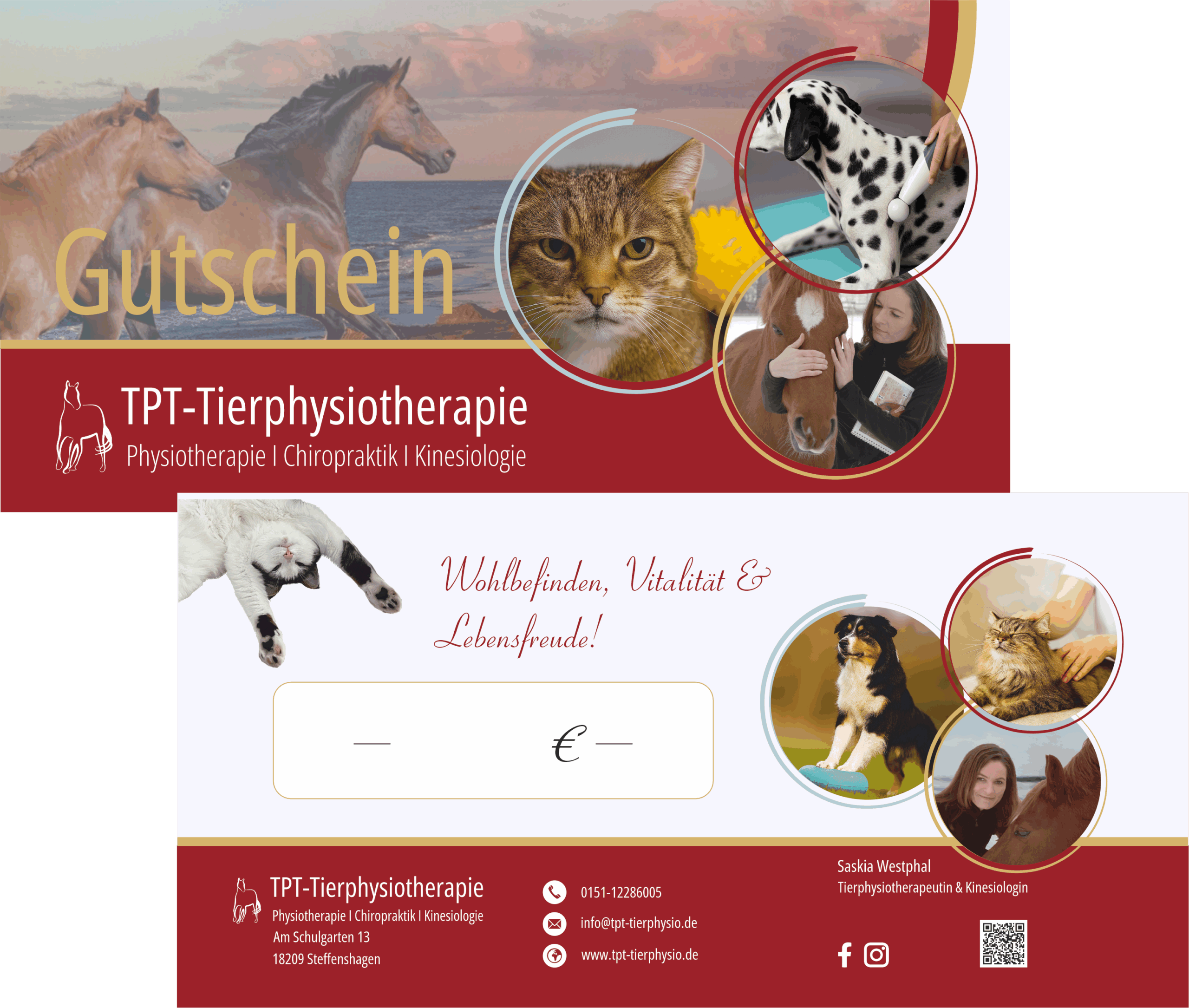 Immer eine schöne Idee zum Verschenken. Ob zur gesundheitlichen Unterstützung oder als liebevolle Aufmerksamkeit. Gutscheine sind individuell einlösbar für alle Leistungen rund um Physiotherapie, Chiropraktik und ganzheitliche Tiertherapie. Schreib mir eine Mail oder PN – und je nach Wunsch sende ich dir deinen Gutschein digital oder per Post nach Hause.